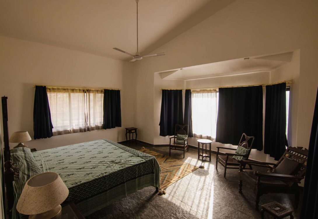 The villa’s spacious layout is crafted to enhance natural light and ventilation, making every corner feel open and inviting. The living area features beautifully curated interiors with handcrafted wooden elements, intricate artwork, and warm earthy tones, reflecting India’s rich heritage while maintaining a modern touch. Each of the four bedrooms is a sanctuary of comfort, adorned with classic Indian motifs, elegant furnishings, and large windows that open up to serene views of nature. Whether you seek relaxation or inspiration, this villa provides the perfect ambiance for both.